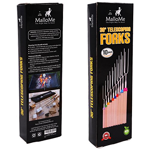 ONLY MalloMe WILL LAST! BEWARE OF CHEAP KNOCK OFFS! Highest quality FDA APPROVED power welded forks use Non-Toxic STAINLESS STEEL to ensure safe roasting. PERFECT ROAST: Two prongs to prevent marshmallow from spinning on stick when melting. EASY CLEANING & STORAGE: Retracting fork design and heat-resistant canvas pouch are convenient for long camping trips or storing at home