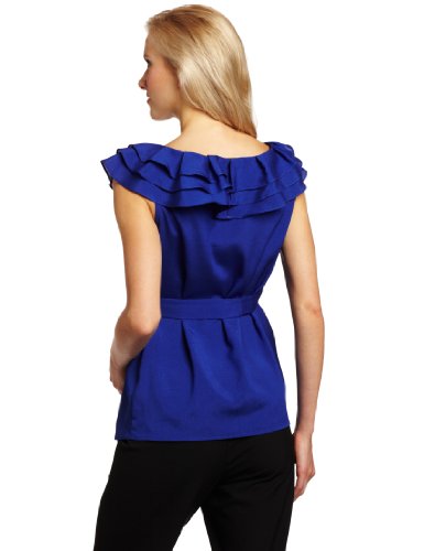 Layers of ruffles sweep across the neckline to give it a flirty look