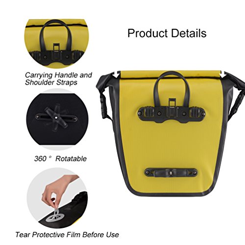 -. Feature : WATERPROOF:Tough welded seams waterproof for heavy rain. Heavy duty material for extreme conditions.RockBros bike pannier bag design for you avoiding the dilemma from leaky bag / DELICATE DETAILS:TPU fabric easily clean with a wet terry cloth,PP board keep the shape and large capacity,reflective logo increase visibility in the dark night / MULTIPURPOSE APPLICATIONS:Clamps securely hold the pannier on the rear rack.Suitable for variety kinds of mountain bike ,road bikes and casual bikes / PORTABLE:Quick release system, easy to be fixed on rear rack,shoulder straps for portable / NEW FOLDING LOCK:Roll-down closure bag sealed way without zippers preventing water into the bag inside.Buckle folding securely storage belongings