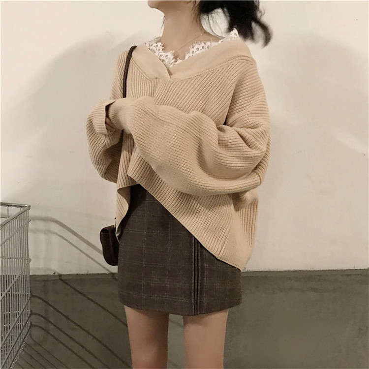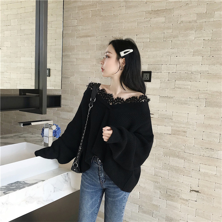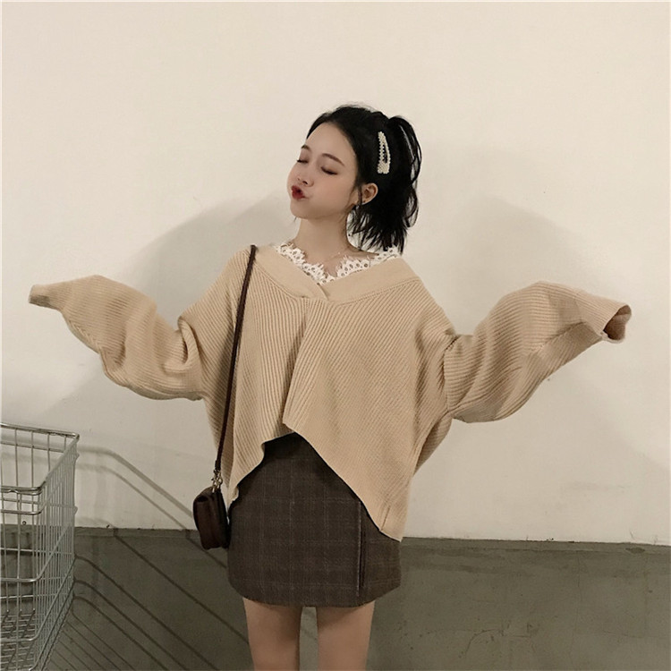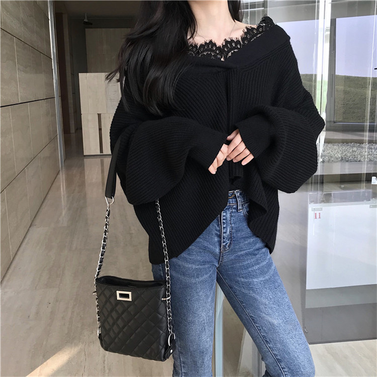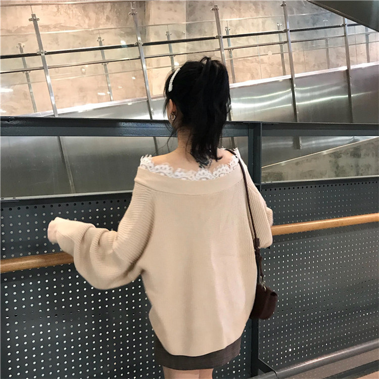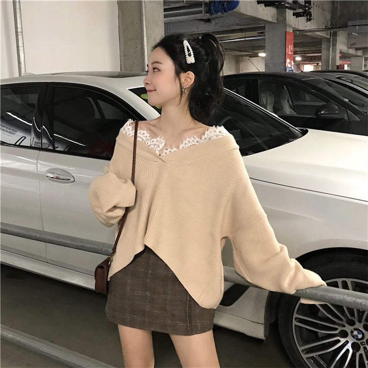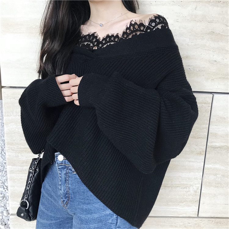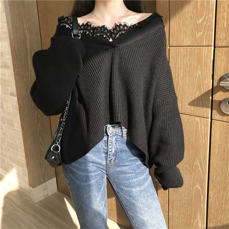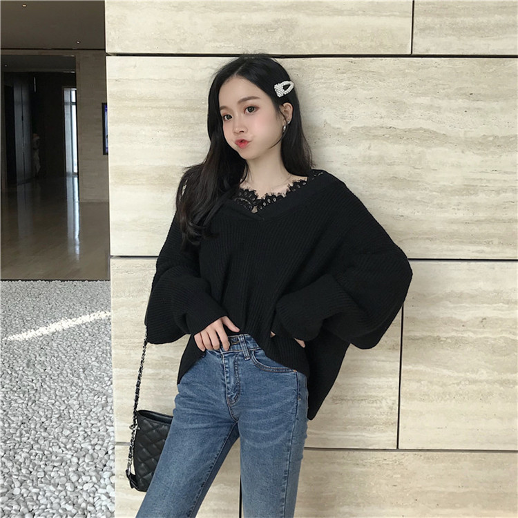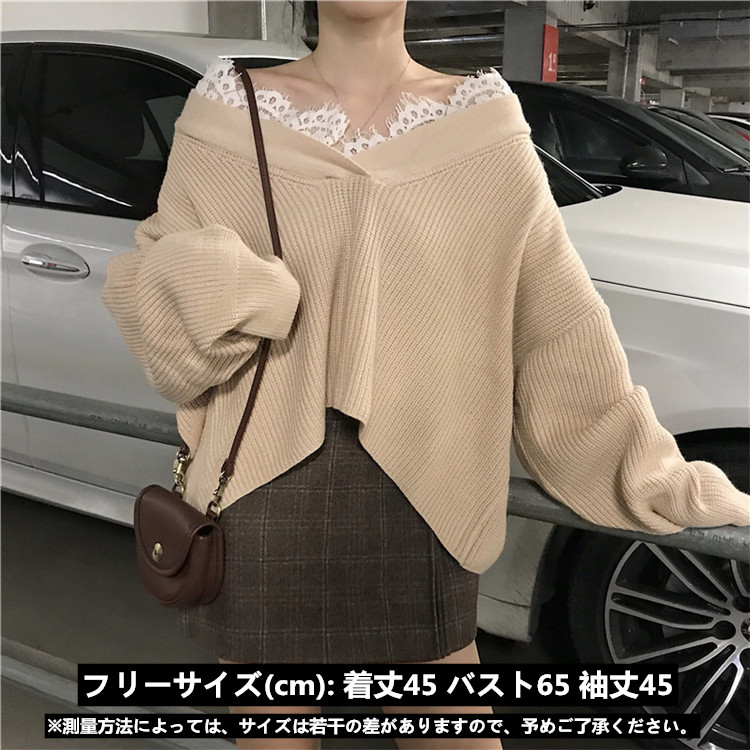 ★ニット セーター トップス レディース レース Vネック ローゲージ ゆったり ゆるニット 体型カバー 長袖 ニットウェア オシャレ 19010508★