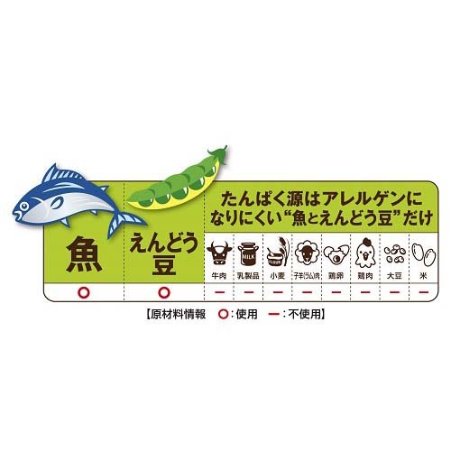 原材料:豆類(えんどう豆たん白、えんどう豆繊維)、でん粉類(コーンスターチ)、魚介類(フィッシュミール:DHA・EPA源、フィッシュエキス)、油脂類(動物性油脂)、種実類(ゴマ粉末)、糖類(フラクトオリゴ糖)、セレン酵母、ビタミン類(A、E、K3、B1、B2、パントテン酸、ナイアシン、B6、葉酸、ビオチン、B12、C、コリン)、ミネラル類(カルシウム、リン、ナトリウム、カリウム、塩素、鉄、コバルト、銅、マンガン、亜鉛アミノ酸複合体、亜鉛、ヨウ素)、酸化防止剤(ローズマリー抽出物、ミックストコフェロール)