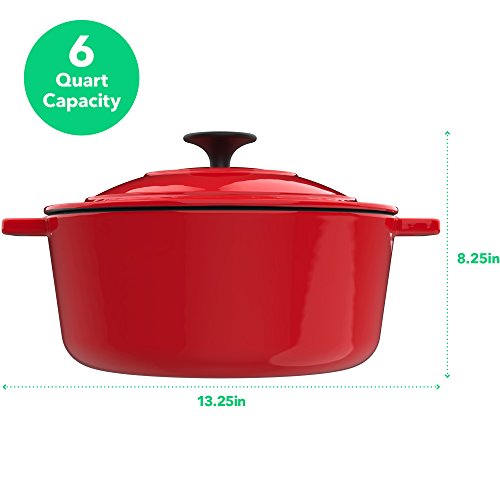 Studio : Vremi Publisher : Vremi Product Description Throw your pans in the air, and treat this Vremi Enameled Cast Iron Dutch Oven like you really care! Exclusively designed for dishes requiring long, slow cooking, its generous six quart capacity enables you to easily braise meat and prepare vegetable soups, stews, chili and a wide variety of delicious one-pot meals. With ergonomic handles and an advanced interior enamel that resists chipping, cleans easily and also doubles as an attractive serving dish, this oven blends the best of the past with the latest innovations in comfort and functionality. Create culinary delights with this essential dutch oven by your side. Available in three fun color choices. Product Details - Dutch Oven size: 13.2 x 10.6 x 8.25 inches including lid (33.5 x 27 x 21 cm)