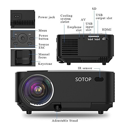 Home theater Projector, SOTOP S20 1500 Lumen 800x480P LED Mini Projector with HDMI AV VGA USB SD Audio Support PC Laptop DVD Flash Drive Console PS3 XBOX for Video Movie Game Music