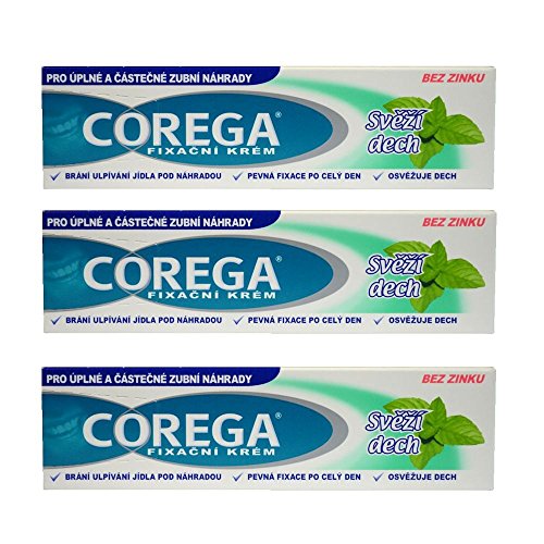 Studio : gsk Publisher : gsk Binding : Misc. Product Description This is original Corega denture adhesive cream - Fresh Mint (3 pack). The pack includes 1 tube in a weight of 40 g. Corega fresh mint is part of the Corega range of zinc-free denture adhesives and is formulated to give you all-day hold of your denture. Even if your dentures fit well they can let in little bits of food and cause you discomfort. But Corega is proven to seal out more food particles. How to apply cream: Apply cream to clean dry dental replacement once a day in short strips. Rinse your mouth and press the replacement to the right place, hold it tight for a while, then bite for a few seconds to secure it. Start with a small amount of cream first. When large amounts are applied, it may be pushed out on the sides of the dental replacement. You may need more tests to find out what amount of cream is right for you. For a secure attachment of the substitute, apply the cream once a day. If you need to apply the cream several times a day, consult your dentist. Removal Procedure: Rinse your mouth with warm water and then slowly remove the dental replacement. Remove the remnants of the cream from the tooth replacement and from the mouth using warm water and a soft toothbrush. Carefully clean your dental replacement with COREGA cleansing tablets. 0