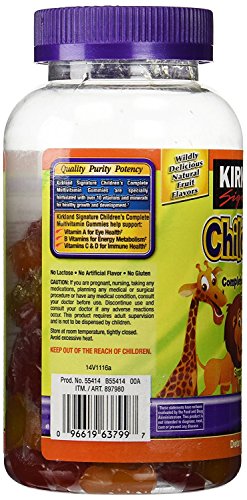 Kirkland Signature Complete Children's Multivitamin Gummies are a perfectly balanced formulation of key vitamins and minerals to support the healthy growth and development of children. These gummies are wildly delicious! Natural fruit flavors in orange, cherry and green apple. Designed specifically to meet the nutritional needs of children who may not be able to get enough vitamins from diet alone.Feature