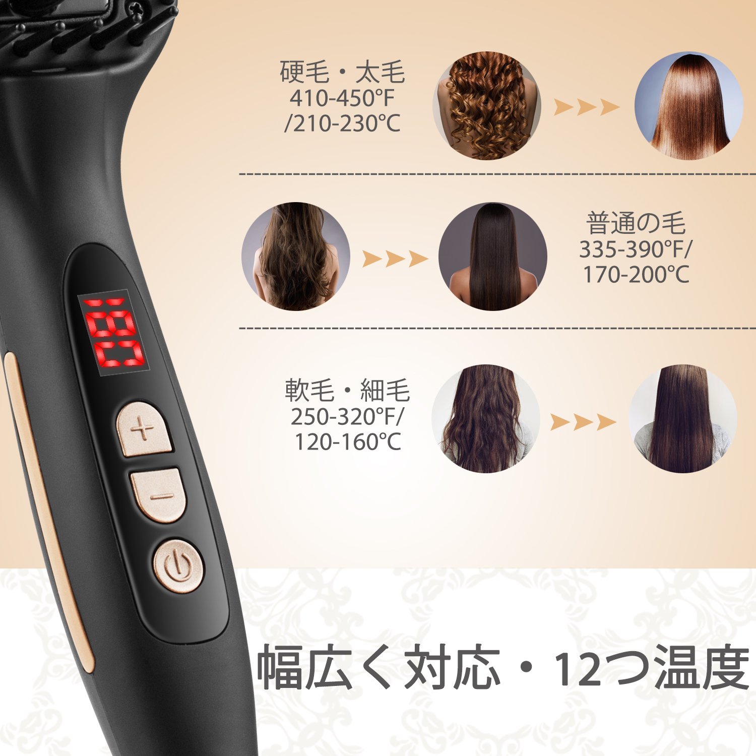 6,000,000 minus in occurs and the surface portion of the hairbrush teeth is made from a special ceramic material, so there is no case that the skin will burn even at high temperatures.