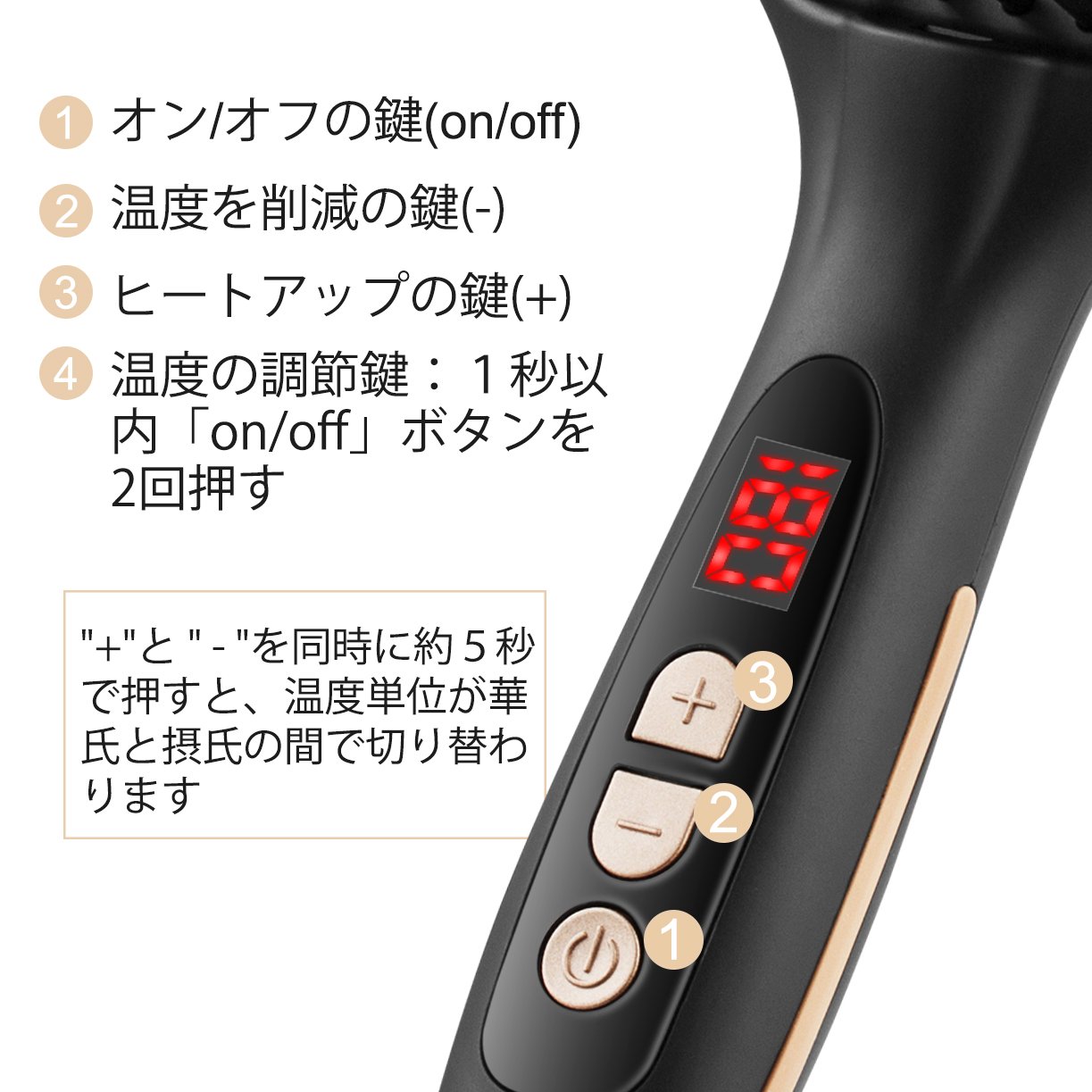 3. Adjustment of temperature: If locked (automatic lock function), please release the lock by pressing the "ON / OFF" button twice.