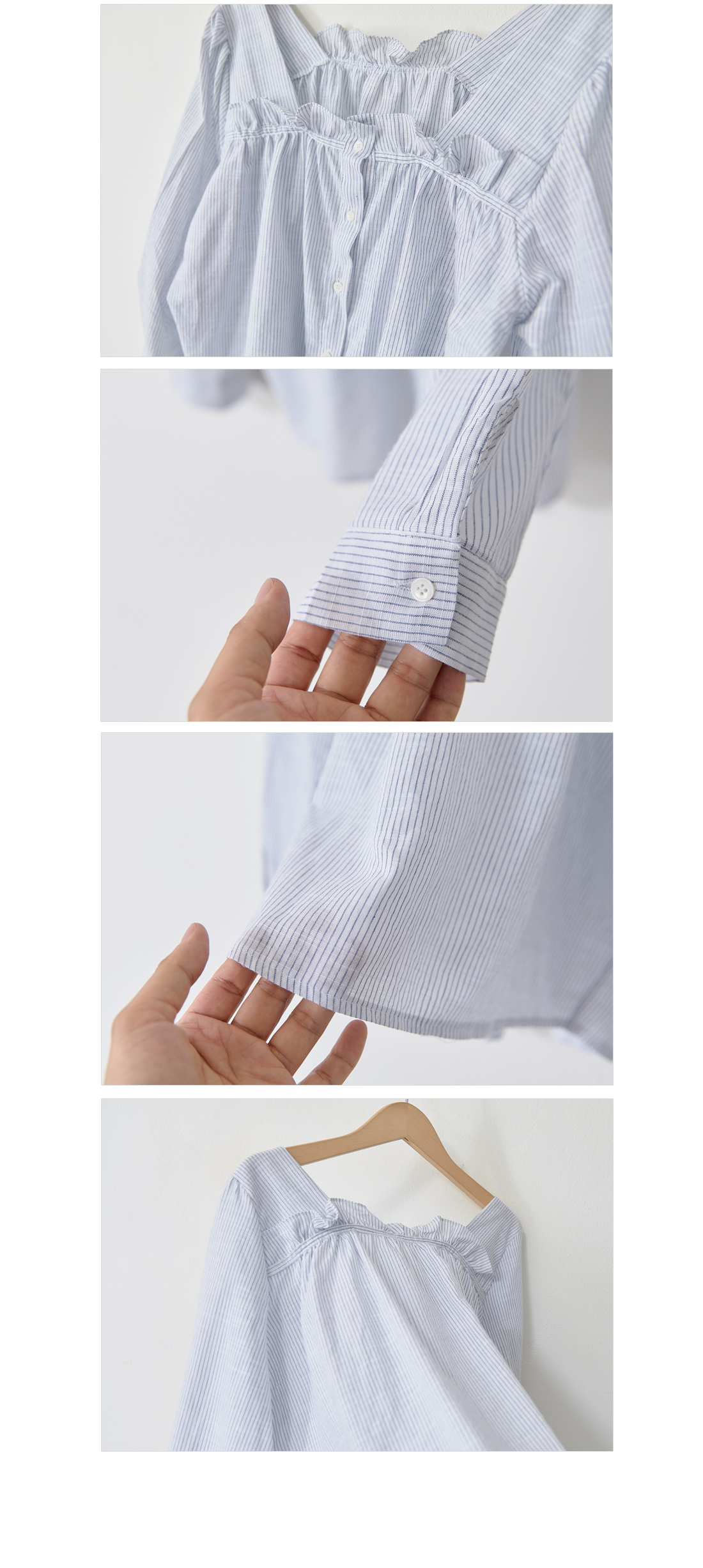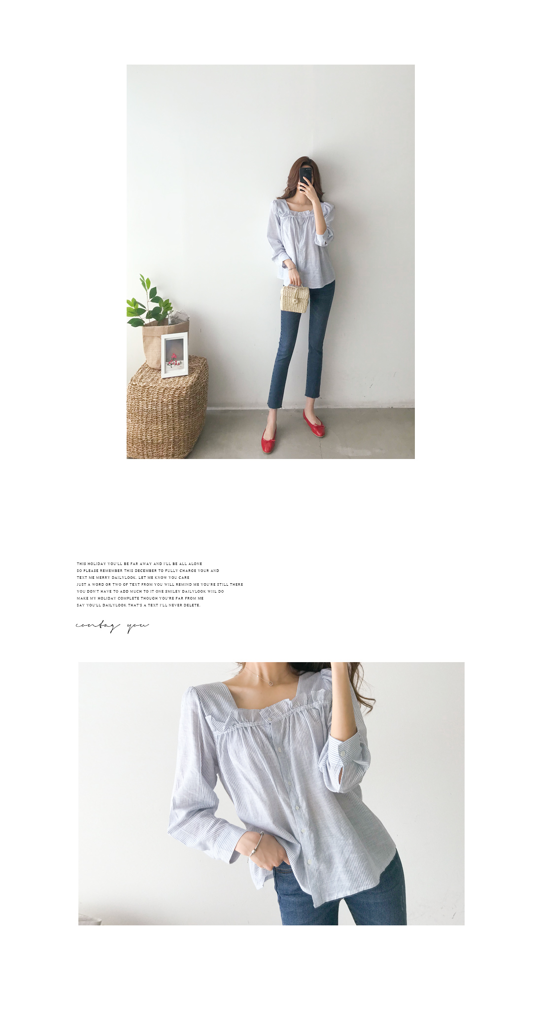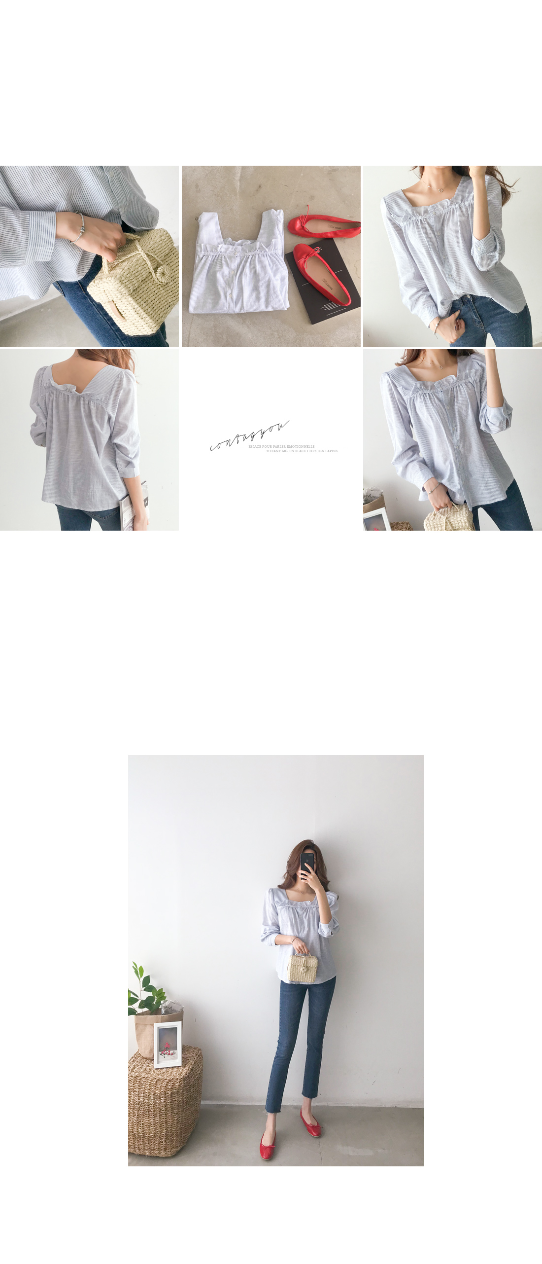 가볍고 부드러운 코튼 소재로 유연하고 산뜻한 착용감을 자랑함은 물론, 목선부터 쇄골라인까지 한층 더 가녀리면서도 여리여리하게 표현해주는 스퀘어 네크라인을 따라 프릴 디테일까지 자리해 로맨틱한 감성을 가득 가득 불어 넣어주어 화사하게 밝혀주는 포인트 룩으로도 GOOD~ 또한, 프레시한 스트라이프 패턴으로 여름에 걸맞는 COOL한 느낌마저 전해드리며 팬츠, 스커트 등 어디에 매치해주셔도 스타일은 UP UP! 특별한 날, 꼭 함께하고 싶은 블라우스로 데일리부터 데이트룩, 모임룩 등 깔끔하면서도 스페셜한 블라우스로 적극 추천드릴게요:)