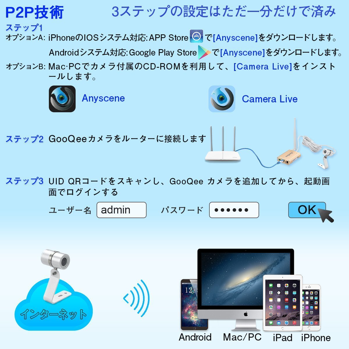 P2P technology, easy 3 step setting, Japanese application, pre-recordable