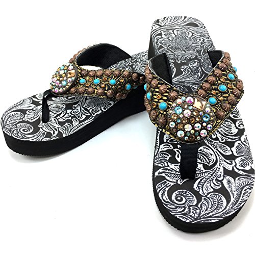-. Title : Western Peak Women's Full Rhinestones Round Concho Bronze Brown Turquoise Flip Flops Sandals