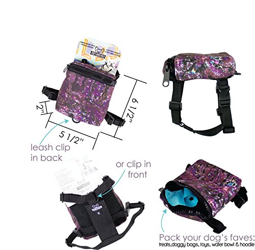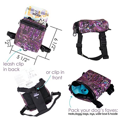 -. Feature : Get the function of a harness, plus pack your dog's faves: treats, toys, waste bags,ball,bowl,hoodie / Great for everyday walks, day trips, city exploring, hiking, weekend getaways, and travel / Adjustable straps make it an easy fit as well as able to fit over your pup's outerwear / Custom, designer prints make this dog backpack a fashionable alternative / Never forget poo bags again!