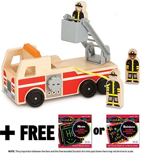 -. Binding : Toy -. Brand : Melissa & Doug -. EAN : 9899999539575 -. Feature : ONE FREE Melissa & Doug Scratch Art Mini-Pad is bundled with this item. The style of the mini-pad you receive is randomly picked. The Scratch Art Mini-Pad is considered a FREE bundled item. If you return this item, please return it as well. / Includes 4 high-quality wooden pieces -- fire truck and 3 firefighters. / Fire truck features roll-up hose and lifting ladder. Smooth-rolling wheels. / Firefighters "hold" the hose! / Ideal for building sorting, counting skills, and for hours of imaginative play! For age 3+. -. IsAdultProduct : 0 -. Label : Melissa & Doug -. Manufacturer : Melissa & Doug -. Model : 9391 -. MPN : BCC9M9575 -. PartNumber : BCC9M9575 -. ProductGroup : Toy -. ProductTypeName : TOYS_AND_GAMES -. Publisher : Melissa & Doug -. Studio : Melissa & Doug -. Title : Wooden Fire Truck + FREE Melissa & Doug Scratch Art Mini-Pad Bundle [93910]