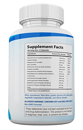 ★ PREMIUM ALL-NATURAL BLEND of vitamins, herbs, minerals, herbs and amino acids designed by experts in the field of modern nutritional science. These natural ingredients include: vitamin b-12, iodine, magnesium, zinc, selenium, copper, manganese, molybdenum, l-tyrosine, schizandra, ashwagandha root, bladderwrack, & cayenne pepper. This formula is effective for both women and men!
