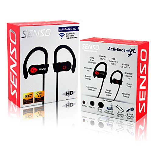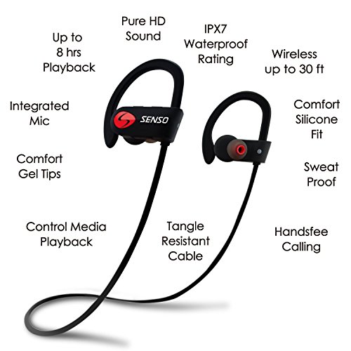 SENSO Bluetooth Headphones, Best Wireless Sports Earphones w/ Mic IPX7 Waterproof HD Stereo Sweatproof Earbuds for Gym Running Workout 8 Hour Battery Noise Cancelling Headsets
