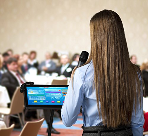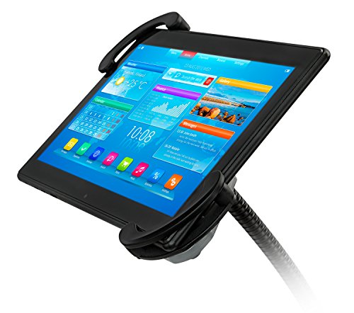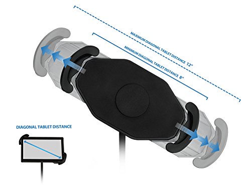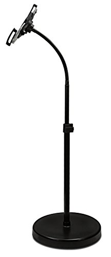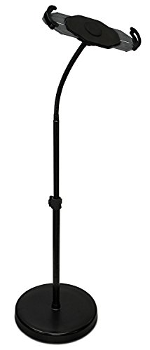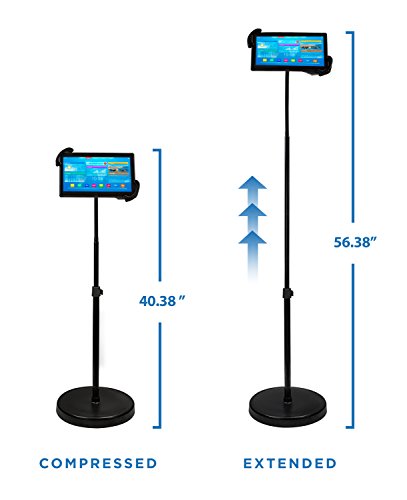 -. Feature : Weighted tablet stand that fits any 7 inch to 11 inch device: iPad, Kindle, Samsung, Microsoft, or Sony. The computer mount has a maximum height of 52 inches and a minimum height of 25 inches. The adjustable-height telescoping pole can be raised or lowered by opening and closing a smart clamp located half-way down the length. / Gooseneck is swiveling and full motion. The stand can be adjusted to fit any angle or orientation. The flexible gooseneck measures 12 inches in height and securely holds its position with ease. The neck can be adjusted to fit any of your needs whether you're standing, sitting, or laying down. / Rotating touch-screen mount is equipped with a 360 degree rotation. The mount can spin around to give your tablet any orientation or direction. The grips on the mount rotate 15 degrees as well providing a flexible range of positions specific for your tablet model. The mount and grips are also equipped with soft EVA cushions protecting the surfaces, back, and edges of your case or display. / Easy locking and unlocking features keep your tablet in place. The adjustable widths of the mount make it multi-device capable and ensure a secure fit between the grips and your product. The lock feature is safely hidden on the underside of the device as an easy-to-use switch. / Stand is made from solid ABS thermoplastic and steel construction in a glossy black finish. The base of the stand is 10 pounds making it easy to carry and stable on the floor. The hardware comes with an extra EVA cushion to support thinner devices.