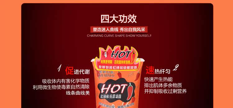 全新一代修身堂红辣椒纤体按摩凝露含天然红辣椒油、天然蜂胶、天然萃取生姜及海藻精华成份,对于脂肪肥厚部位者能直接促进备注循环、滋润、收缩、以达到窈窕曲线、纤体美体效果
