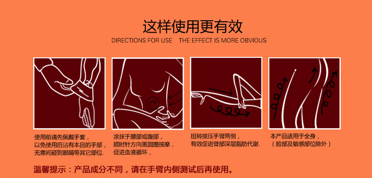 可敷于较粗糙、脂肪较肥厚部位(手腕、手臂、腰部、小腹、臀部、大腿)由下、往上方向按摩。