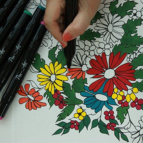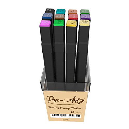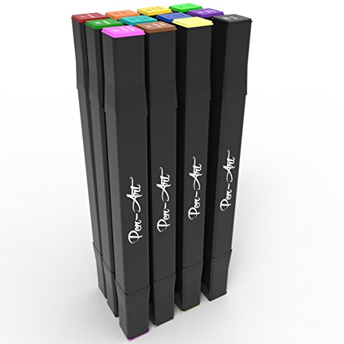 Pen-Art Adult Coloring Markers - Chisel and Fine Dual Tip Drawing Markers For Artists, Highlighters, Sketch with Carrying Case in 12 colors
