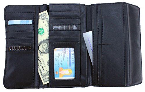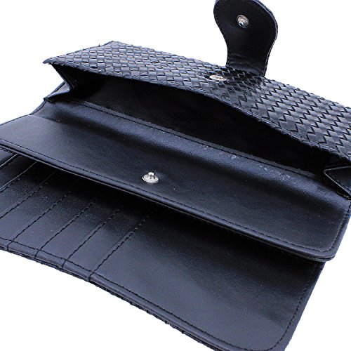 -. Feature : Women's Fashion Clutch Trifold Style Vegan Wallet / Metal Snap Closure / Exertior Button Snap Pocket / PVC Leather Material with Polyurethane (Synthetic / Vegan) / 18 Credit Card Slots, 4 Large Slot Pockets, ID Window