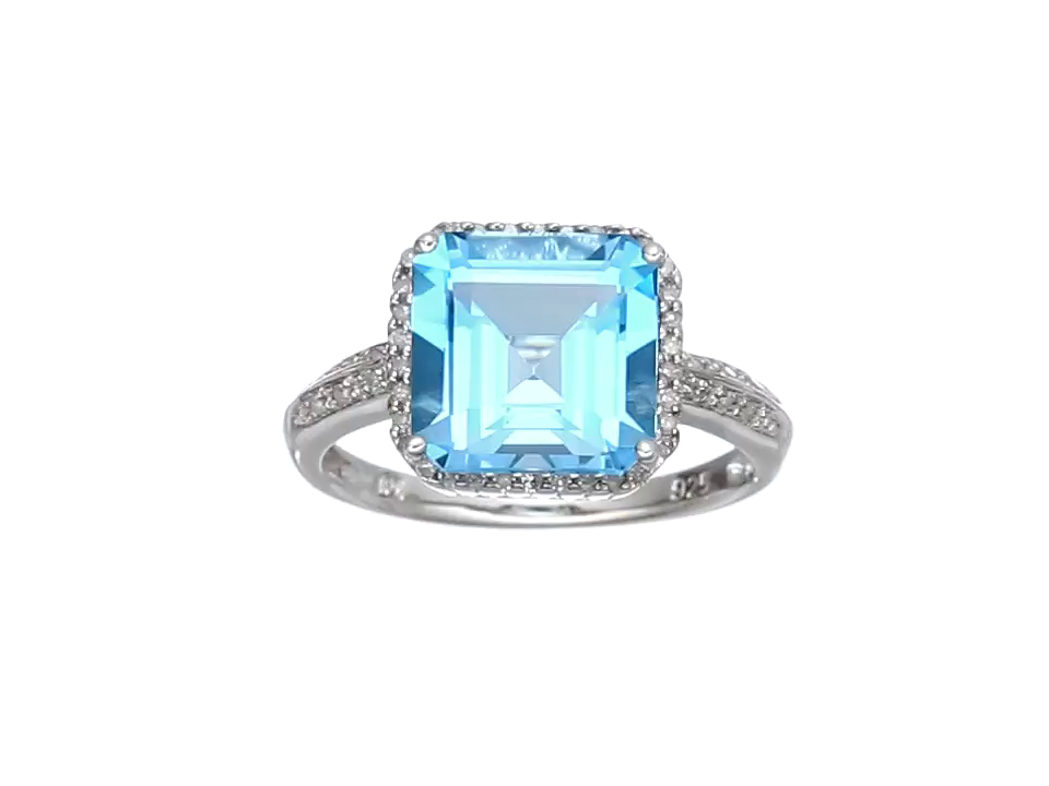 Sterling silver ring featuring asscher-cut gemstone in halo of small diamonds