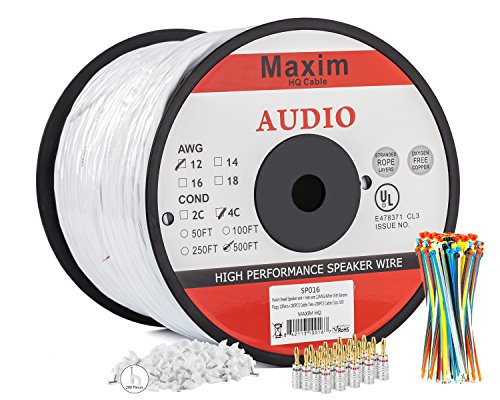 -. Binding : Electronics -. Brand : Maximm -. EAN : 0842113100167 -. Feature : PROFESSIONAL QUALITY SPEAKER WIRE: Maximm's professional grade 4-Conductor in wall speaker wire. Connect speakers to AV receivers and amplifiers for crystal clear clarity and maximum conductivity. / 12 AWG & CL3 RATED: American Wire Gauge rated gauge 12. CL3 rating permits in wall installation in commercial, residential, and office spaces. No more dangling wires to hide behind entertainment centers and future. / INCLUDES BANANA PLUGS, CABLE CLIPS & TIES: Speaker Wire pairs easily with included banana plugs for easy connectivity and can be securely anchored with cable and clip ties each included at no additional cost. / HIGH STRAND OXYGEN FREE COPPER: Buy Wire that you know will last for years and years to come. Refined copper alloy conductors are free of 99.9% Oxygen preventing corrosion to the speaker wire and ensuring maximum conductivity / DURABLE YET FLEXIBLE INSULATED JACKET: Encased in flexible plastic making installation around tight angles and corners easy. Casing is clearly marked in 2 foot intervals for easy and accurate measuring. -. Label : Maximm -. Manufacturer : Maximm -. PackageQuantity : 1 -. ProductGroup : Speakers -. ProductTypeName : CABLE_OR_ADAPTER -. Publisher : Maximm -. Studio : Maximm -. Title : In Wall Speaker Wire | 500 Feet | 12AWG CL3 Rated 4-Conductor Wire White Oxygen Free Copper includes banana plugs cable clips and ties -. UPC : 842113100167