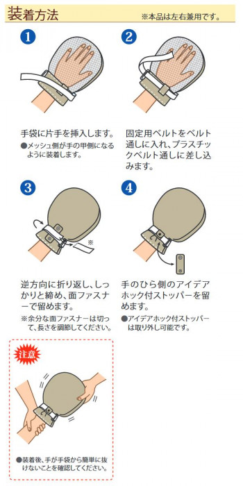 2層構造のパッドにより物が掴みにくくなっています。手首ベルトの上からアイデアホック付ストッパーをかぶせて留めるため、使用者本人にはミトンを外しにくい構造です。手の甲側にメッシュ素材を使用しているため蒸れにくく、またミトンをつけたままでも手の状態を確認することができます。 |