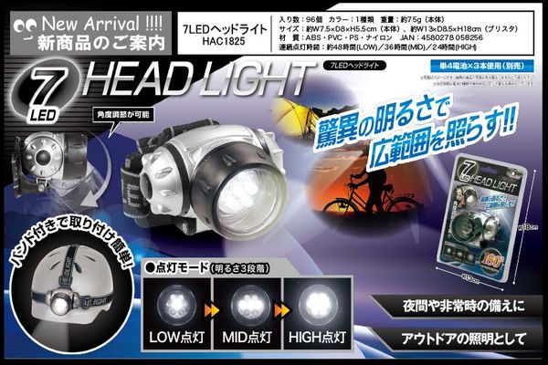 ●頭部装着で両手が自由に。3段階の明るさ調整が可能なヘッドライトです。