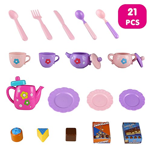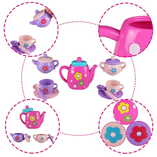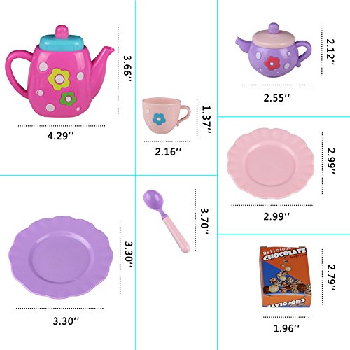 -. Feature : Durable Material - tea set made by high-quality and non-toxic plastic, kids can play this toys years after years. / Assorted Tea Set - : This kid's tea set includes 18 pieces in total: 2 teapots with lid, sugar bowl with lid, 3 desserts, 3teaspoons, 2 cups, 2 saucers, 2 pies, fork, knife. / Perfect Size and Safe - Suitable size for children's small hands and easy to pick up, smooth edges, safe for kids to play. / Pretend Play Game - Have a tea party, kids can learn the ways of greeting people when enjoying this toy with their family and friends. / Notice:CHOKING HAZARD. Small part.Not suitable for kids under 3 years old.