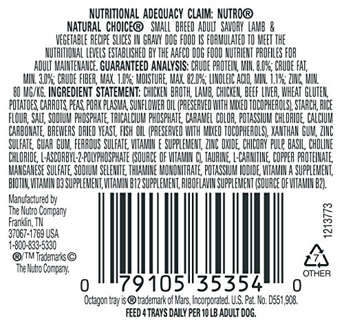 -. Binding : Misc. -. Brand : Nutro -. Label : The Nutro Company -. Manufacturer : The Nutro Company -. PackageQuantity : 1 -. ProductGroup : Pet Products -. ProductTypeName : PET_SUPPLIES -. Publisher : The Nutro Company -. Size : oz -. Studio : The Nutro Company -. Title : NUTRO Natural Choice Small Breed Adult Wet Dog Food
