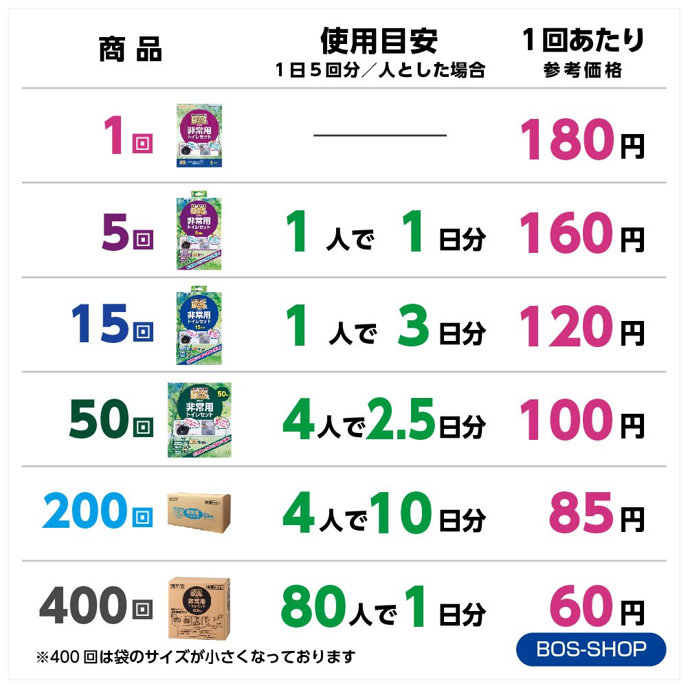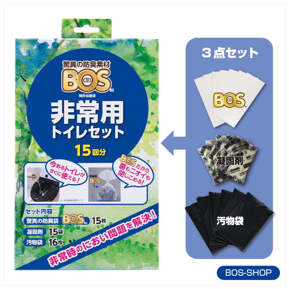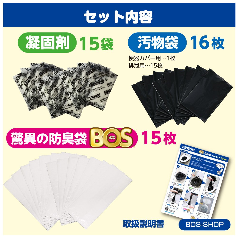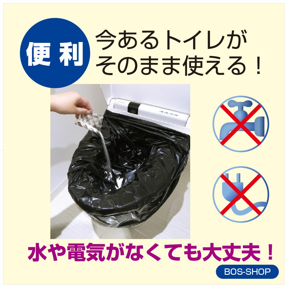 With "BOS emergency toilet set" you do not have to go to evacuation centers because of the toilet.