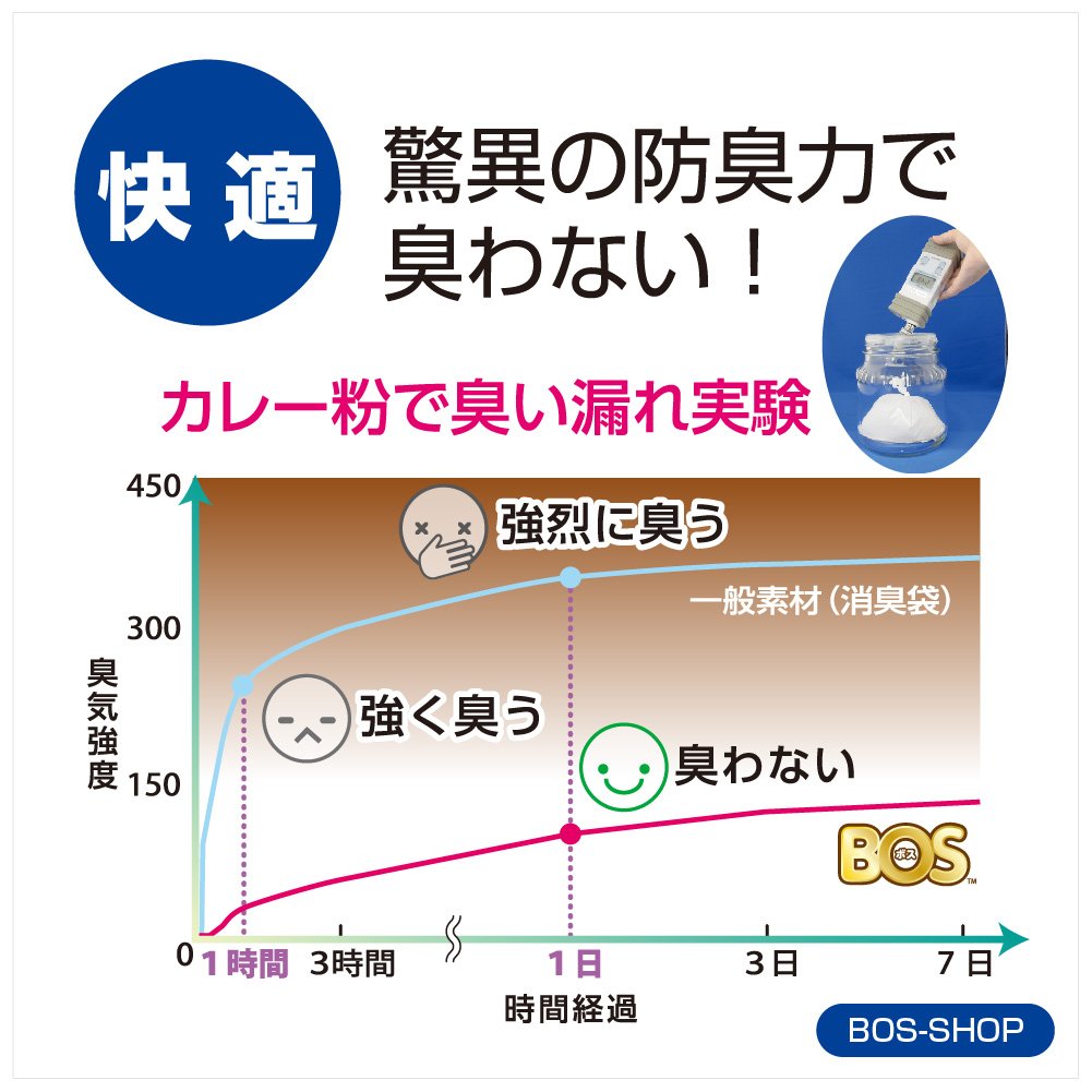 BOS is a material with an astonishing deodorizing power that puts poop and does not feel the smell almost even if I let the nose close after leaving for a while.