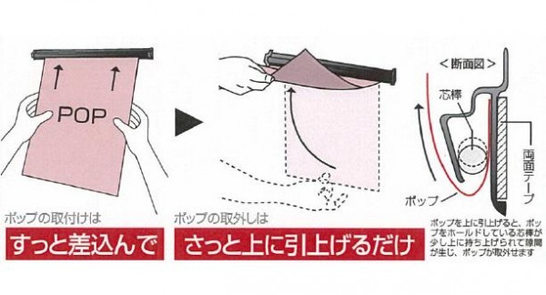 fk094igrjs差し込むだけでOK!!シンプル構造でポップの取外しが簡単。芯棒ががっちりとポップをホールドします。 製造国:中国 素材・材質:アルミ、樹脂 商品サイズ:幅1200mm 重量:300g 付属品:取付用ビス、両面テープ※お届け地域により、別途運賃がかかる場合やお届けできない場合がございますので、お問い合わせ下さい。