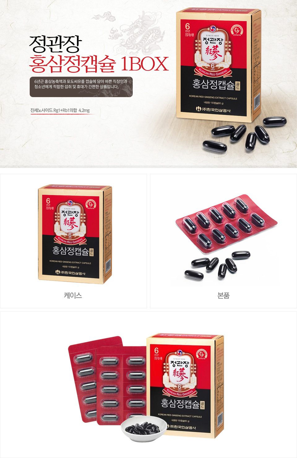 紅参濃縮液粉末(6年根、ジンセノサイドRg1 + Rb1 + Rg3 4.5mg / g、国産)35%(原料三配合比率:ホンサムグン70%、ホンミサム30%)、小麦胚芽油(米国産、小麦)、パーム油、ブドウ種子油、蝋、大豆レシチン、da-トコフェロールカプセル成分:ゼラチン(豚)、グリセリン、D-ソルビトール液、コチニール抽出色素、クチナシ黄色素、クチナシ青牛、エチルバニリン
