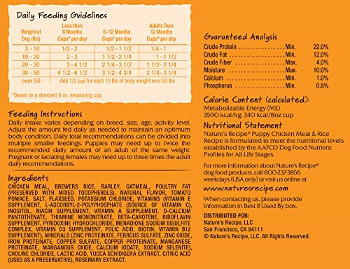 -. Binding : Misc. -. Brand : Nature's Recipe -. Feature : All-natural, carefully balanced formula for rapidly growing puppies with lamb meal as the #1 ingredient / Protein rich to support muscle growth and strength development / Made with egg to support optimal brain function / Contains plenty of carbohydrates to provide enerfy for playing -. Label : Nature's Recipe -. Manufacturer : Nature's Recipe -. Model : 64451455-P -. MPN : 64451455-P -. PackageQuantity : 1 -. PartNumber : 64451455-P -. ProductGroup : Pet Products -. ProductTypeName : PET_SUPPLIES -. Publisher : Nature's Recipe -. Studio : Nature's Recipe -. Title : Nature's Recipe Dry Puppy Food