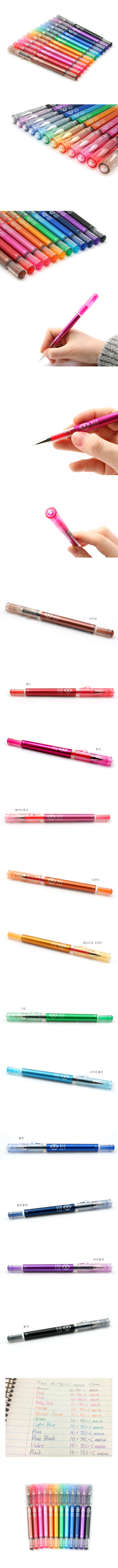 잉크색은 총 12컬러! 특징을 살펴보면, 여타 다른 펜과는 다르게 펜촉을 잡아주는 지점이 3군데라다른 펜보다 볼을 감싸는 면이 적어 자연스러운 볼의 회전이 가능하고 얇은 글씨도 매끈하게 쓸 수 있다. 기존의 펜의 경우 펜의 볼이 아무리 작아도 잉크가 퍼져 버리면 필기면이 가늘어 지지 않겠지만, 첨단 효모수지를 이용한 바이오 폴리머 잉크로 얇고, 또렷하게 써진다.