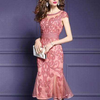 パーティードレス ミモレ丈 刺繍 シースルー 透け感 マーメイド インポート タイト 大人 上品 エレガント お呼ばれ drgz2971