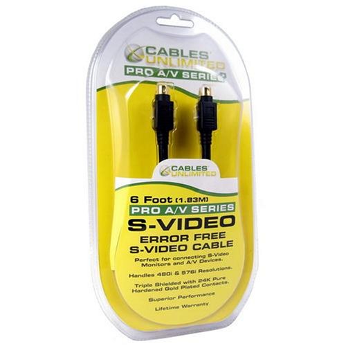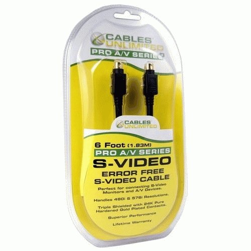 Studio : Cables Unlimited Publisher : Cables Unlimited Binding : Electronics Product Description Cables Unlimited's Pro A/V Series S-Video cables provide an ideal way to effortlessly connect DVD players, VCRs, Digital Satellite Receiver and other S-Video equipped devices together. These High-resolution cables deliver incredible image clarity and vibrant color using high-quality materials to get the best possible performance from your components. 0