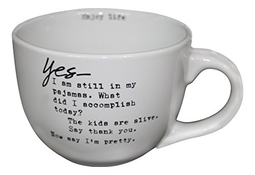 -. Binding : Kitchen -. Brand : Sweet Bird and Company -. Color : White -. EAN : 0841173104832 -. Feature : Saying: "Yes-I am still in my pajamas. What did I accomplish today? The kids are alive. Say thank you. Now say I'm pretty" / Microwave and Dishwasher Safe / 24ounce Mug / 100% Stoneware / Multi Purpose -. Label : Sweet Bird and Company -. Manufacturer : Sweet Bird and Company -. Model : AM003 -. PackageQuantity : 1 -. ProductGroup : Kitchen -. ProductTypeName : KITCHEN -. Publisher : Sweet Bird and Company -. Size : 24 oz -. Studio : Sweet Bird and Company -. Title : Sweet Bird and Company AM003 Oversized Stoneware Mug, 24 oz, White -. UPC : 841173104832