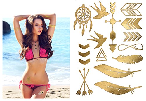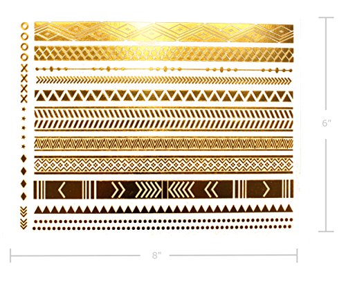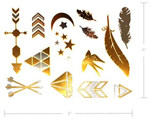 6 X sheets of the latest temporary hair metallic tattoos. Over 75+ vibrant foil tattoo designs in gold and silver. Designs include feathers, arrows, doves, stars, gems, and many beautiful bands that are meant to run down or around your hair.