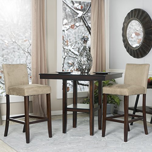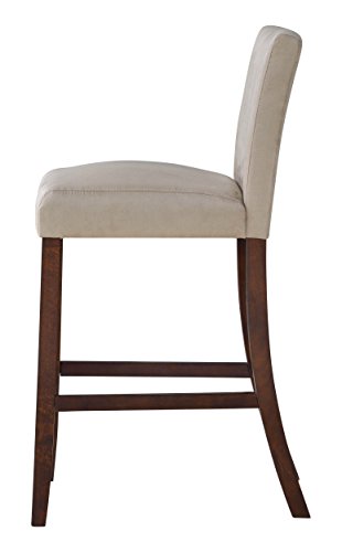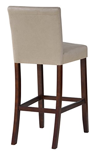 -. Feature : Set Includes: two (2) barstools / Stool Seat Height: 30 inches / Soft beige microfiber upholstery and dark stain tapered wooden legs / Materials: Dacron and Wood / Assembly required