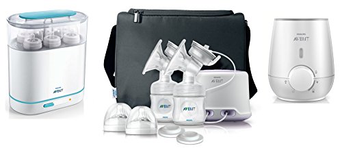 -. Binding : Baby Product -. Brand : Philips AVENT -. EAN : 0713382316095 -. Feature : More comfortable pumping position due to unique design; Features a gentle stimulation mode and 3 pumping settings; Intuitive assembly. Easy visual matching of parts / Compact lightweight design, includes handy travel bag; Includes our Natural bottle and nipple for natural latch on; Easy cleaning due to the small number of separate parts / Adjustable size; 6 minute cycle with automatic shut off; Natural steam sterilization kills 99.9 percent of harmful germs; Suitable for all wide neck and narrow neck bottles / Gently and evenly heats - no hotspots as the milk circulates during warming; Heats 4 ounces of milk in 3 minutes; Convenient defrost setting that defrosts breast milk and baby food; Small design fits on counter or nightstand -. Label : Philips Avent USA -. Manufacturer : Philips Avent USA -. PackageQuantity : 1 -. ProductGroup : Baby Product -. ProductTypeName : BABY_PRODUCT -. Publisher : Philips Avent USA -. Studio : Philips Avent USA -. Title : Philips Avent Double Electric Comfort Breast Pump with Steam Sterilizer & Bottle Warmer -. UPC : 713382316095