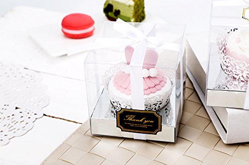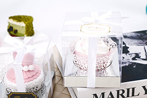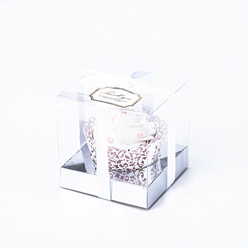 Clear Plastic Cupcake Box With Gift Ribbon, Lace Cupcake Wrapper, Lovely Stickers and Silver Inserts Wedding Party Favor Boxes 3.5 Inch -12 Sets