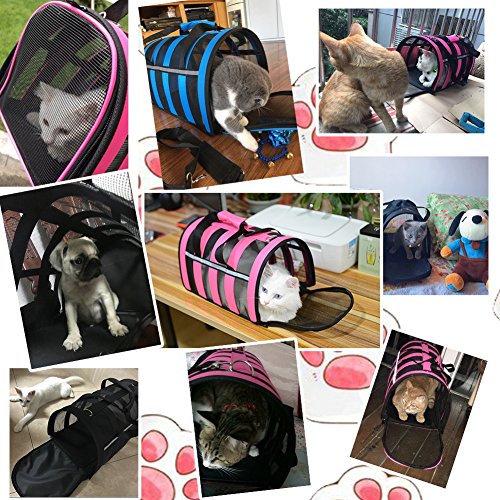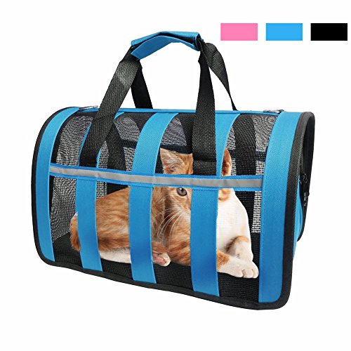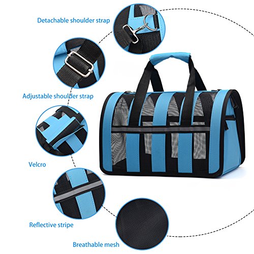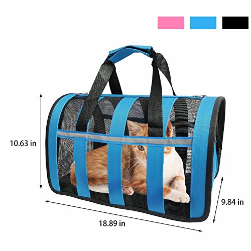 -. Feature : Sturdy and Lightweight: Made by Nylon Materials.Resistant to bite, abrasion, washable, waterproof and Not deformed.This style portable pet carrier's Weights is only 2 lbs, Designed with Breathable Mesh on all Sides for Proper Ventilation?Removable?Padded Shoulder Strap. / Airline Approved Pet Carrier: 19" Length x 11" Width x 10.6" Height - Please consider your pets sizing needs. Recommended For Pets Up to 14lbs * Designed with Ventilated Top & Sides, meets all airline requirements of under forward seat compatibility including Delta, Southwest, United, American, Virgin and others / Best for Outdoor: Fine travel bags works well especially for car ride,keep your cats or puppy comfortable during transport. What's more, this travel tote bag is foldable and waterproof functions with reflective gear, even when you at the outdoor or the rainy day, it is perfect portable bag for your pet. / Safe and Secure:The Opened Mesh Windowfor ventilation, pets get quite enough air and can be seen easily ,Side Pockets for storage toys or treats.It comes with a clip and strap ,you can strap over your shoulder or carry. The bag is nice and works perfect. / Adjustable straps: Adjustable padded straps help to reduce the burden. Extendable strap with buckle keeps the backpack stable.