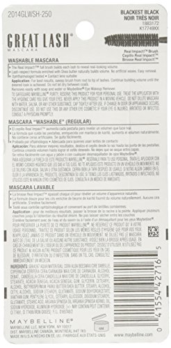 -. Binding : Health and Beauty -. Brand : Maybeline New York -. Color : Blackest Black -. EAN : 0041554427165 -. Feature : No artifical waxes / Not heavy or masking / Easy to remove -. Label : Maybelline, Consumer Products Division of L'Oreal USA S/D, Inc. -. Manufacturer : Maybelline, Consumer Products Division of L'Oreal USA S/D, Inc. -. Model : 250 Blackest Black -. MPN : K1774900 -. NumberOfItems : 1 -. PackageQuantity : 1 -. PartNumber : K1774900 -. ProductGroup : Beauty -. ProductTypeName : BEAUTY -. PublicationDate : 2014-10-20 -. Publisher : Maybelline, Consumer Products Division of L'Oreal USA S/D, Inc. -. ReleaseDate : 2014-09-01 -. Studio : Maybelline, Consumer Products Division of L'Oreal USA S/D, Inc. -. Title : Maybelline New York Great Lash Real Impact Washable Mascara, Blackest Black, 0.37 Fluid Ounce -. UPC : 041554427165