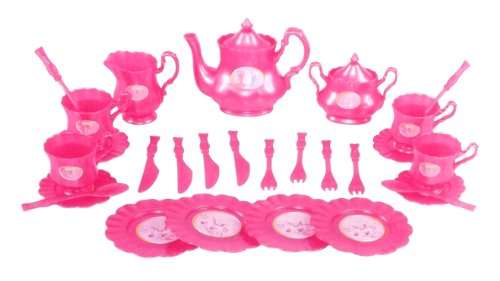 This princess tea party set serves a party of four. Includes 1 tea pot, 2 smaller pots, 4 cups, 4 saucers, 4 plates, and 4 sets of utensils. Each set of utensils comes with fork, spoon, and butter knife. Your kids will enjoy this princess tea set!
