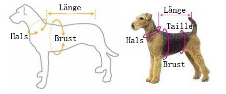 Achtung: Die Rückenlänge ist von Hals bis Schwanz, nicht von Kopf bis Schwanz;Wir bietten Ihnen um die Länge von Ihrem Hund zu messen, damit Ihr Hund eine passende Grösse bekommen kann. Weitere Information über Grössen sehen Sie bitte Produktbeschreibung.