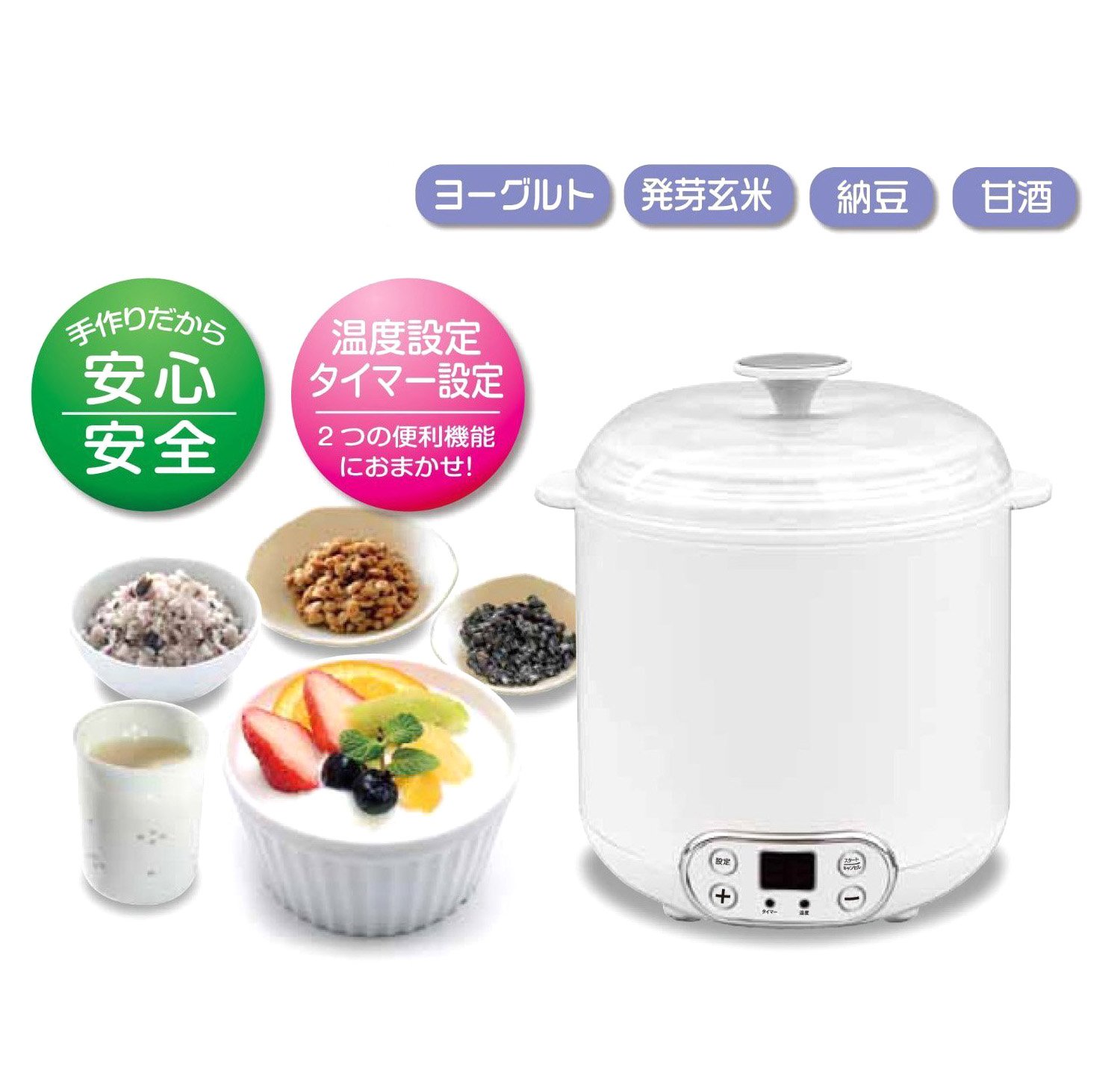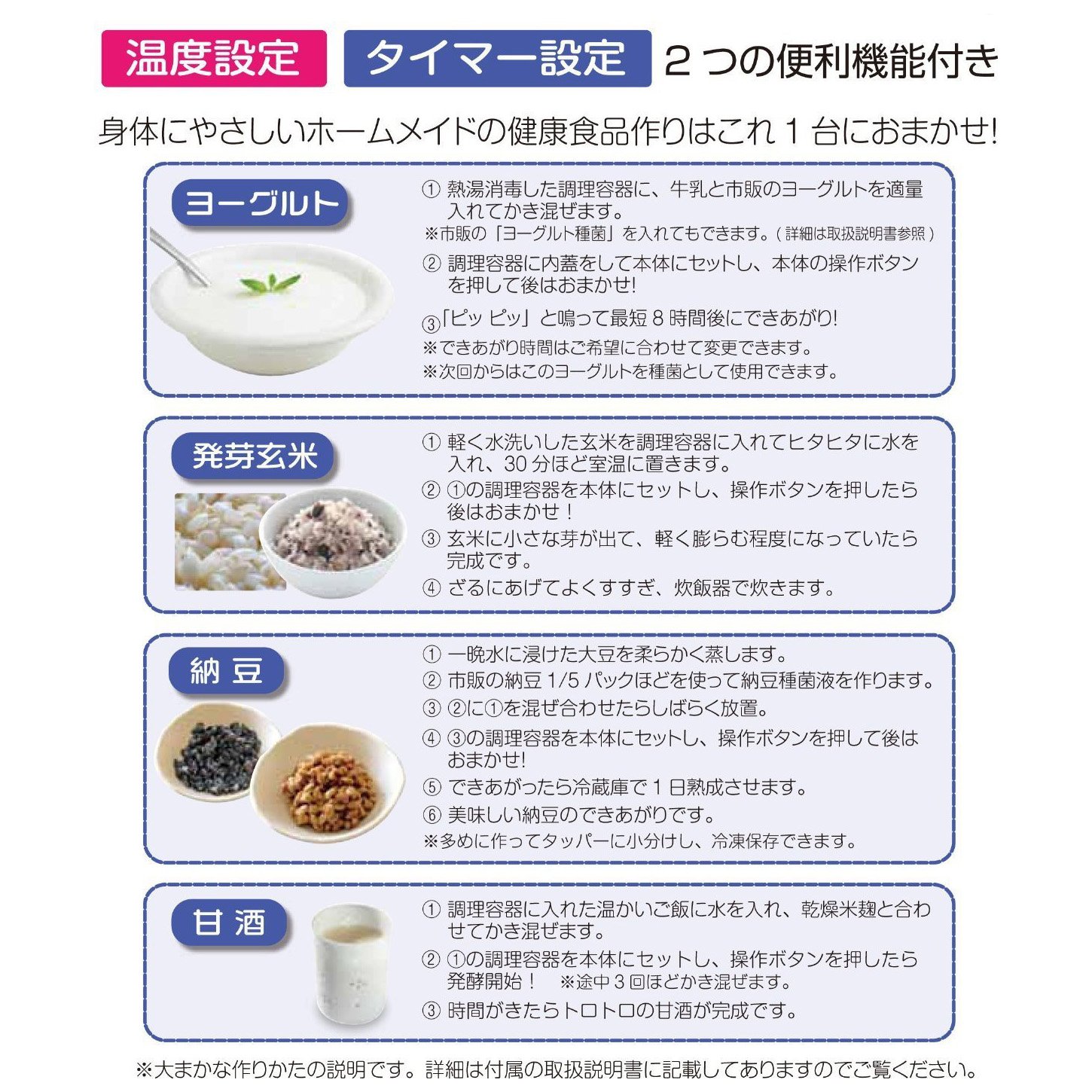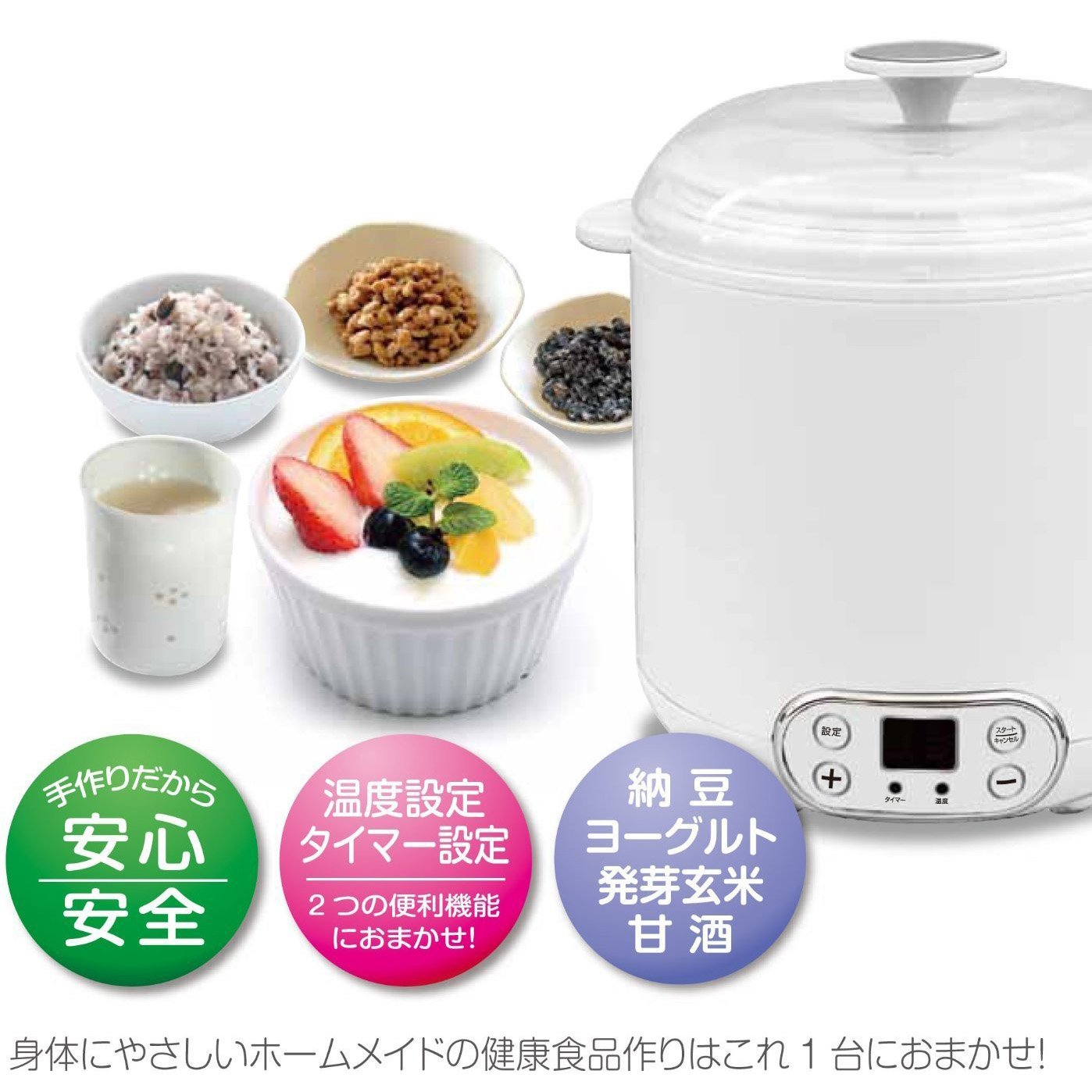 Anyone can easily make fermented foods such as homemade yoghurt · natto · germinated brown rice · sweet sake!