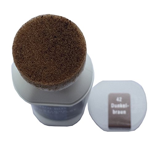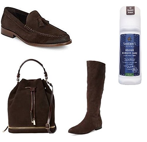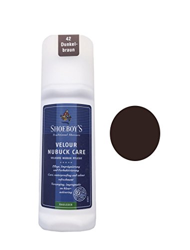 -. Feature : Waterproofs, Conditions, and refreshes color of suede and nubuck leather. For all clothes, shoes, and handbags. / 75 ml.Color: DARK BROWN. Application puts the color back into faded suede and nubuck leather and velour suede. Freshens color and dries to form a protective waterproof membrane for all types of suede and nubuck. Works on the dye under the surface to refresh the top surface suede. Sponge applicator for easy and accurate use. / Sponge tip applicator. Shake well. Simply push the sponge tip application onto the suede. Allow time to dry and brush off with a suede brush. / We recommend using the Shoeboy's Combined Crepe Brush to remove any tough stains and dirt. Then after applying the Shoeboy's Suede Dye, use the Shoeboy's Suded Nubuck Suede Brush to bring your suede back to it's original texture. / Made in Germany. Sold at premium high end designer stores. Money-back satisfaction guarantee.