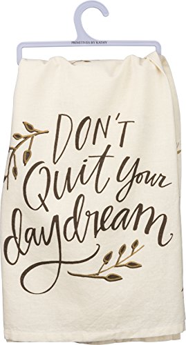 - Dish towel says: "Don't quit your daydream" in black text with a floral design on the back