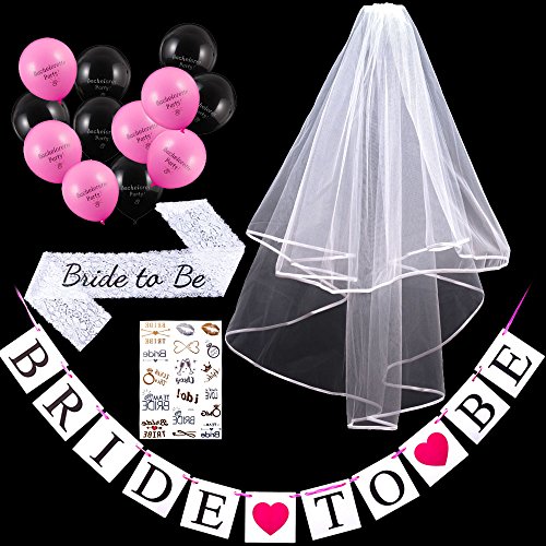 - 3. This Set includes: 1x White 2-Tier Plain Edge Bridal Wedding Veil (Length :77cm /2.53ft), 1x White Lace bride to be letters Satin Sash (Size:69cm / 2.26ft), 12 x Bride to be letters balloons , 1x White bride to be letters Paper banner (Ribbon length: 240cm /7.87ft, Letter size: 12cm x12cm ), Temporary body tattoo (Paper size: 21cm x 15cm)